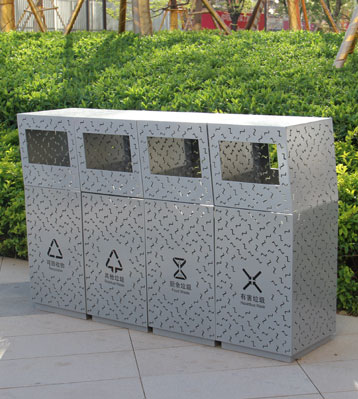 深圳景區不銹鋼鏤空垃圾桶幾何藝術切面造型,采用5mm加厚316#不銹鋼材質而成,單個可組成室內外二、三、四分類垃圾桶。分類標識蝕刻后填漆,不...